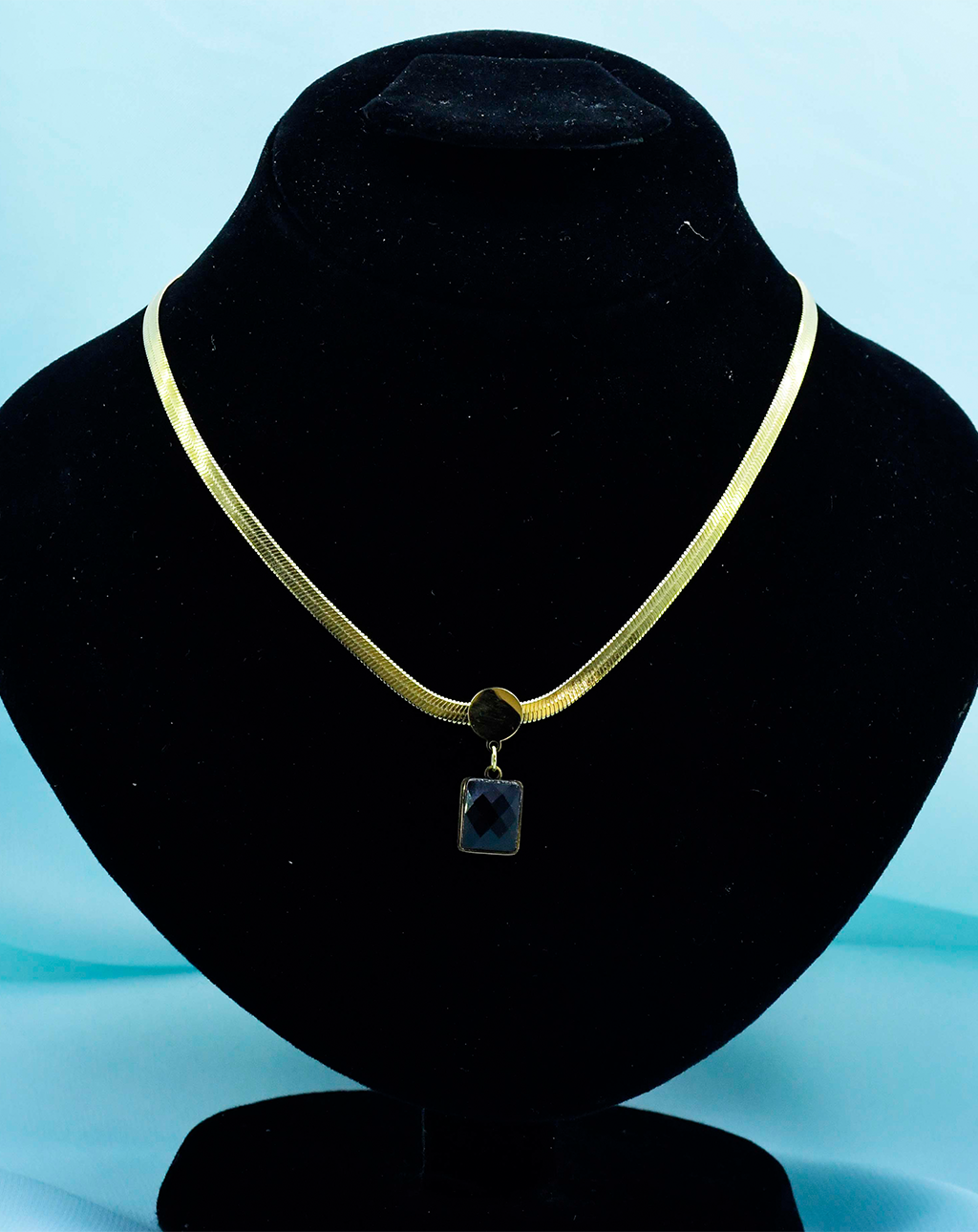 A minimalist chain with a dainty drop pendant and a black stone looks quite bewitching. The rectangular shape of the stone makes it look as contemporary elegant as possible, while gold finish adds classy sophistication to the looks. Yet, as simple as the design is, it is quite striking enough to be worn with any occasion as an accessory.